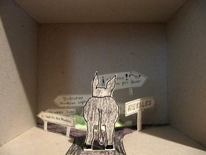 I started writing the text for the Burro story. At first I wasn't sure how to do it, I just knew I wanted it to be in Spanish, and not in very good Spanish. So asking a native speaker to translate it for me wasn't going to work, as the Spanish would have been too good, and writing it myself using a dictionary would have been not good enough. So I decided to write it in English and use a machine translation. Perfect!